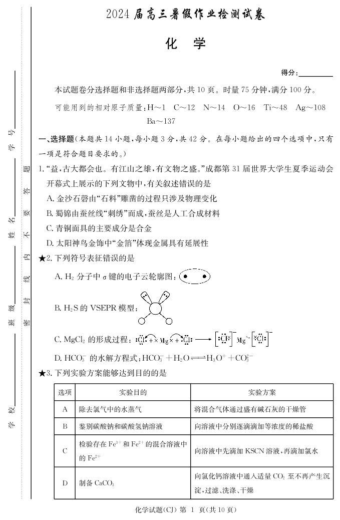 湖南省长沙市长郡中学2024届高三上学期入学考试化学