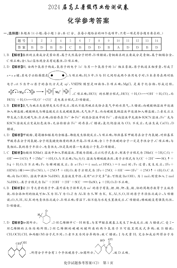 湖南省长沙市长郡中学2024届高三上学期入学考试化学答案