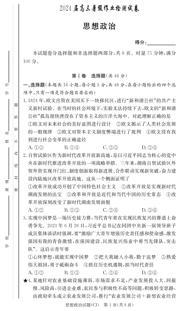 湖南省长沙市长郡中学2024届高三上学期入学考试政治