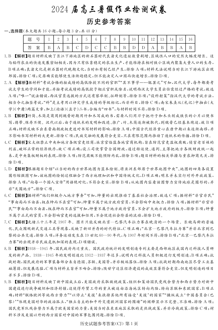 湖南省长沙市长郡中学2024届高三上学期入学考试历史答案