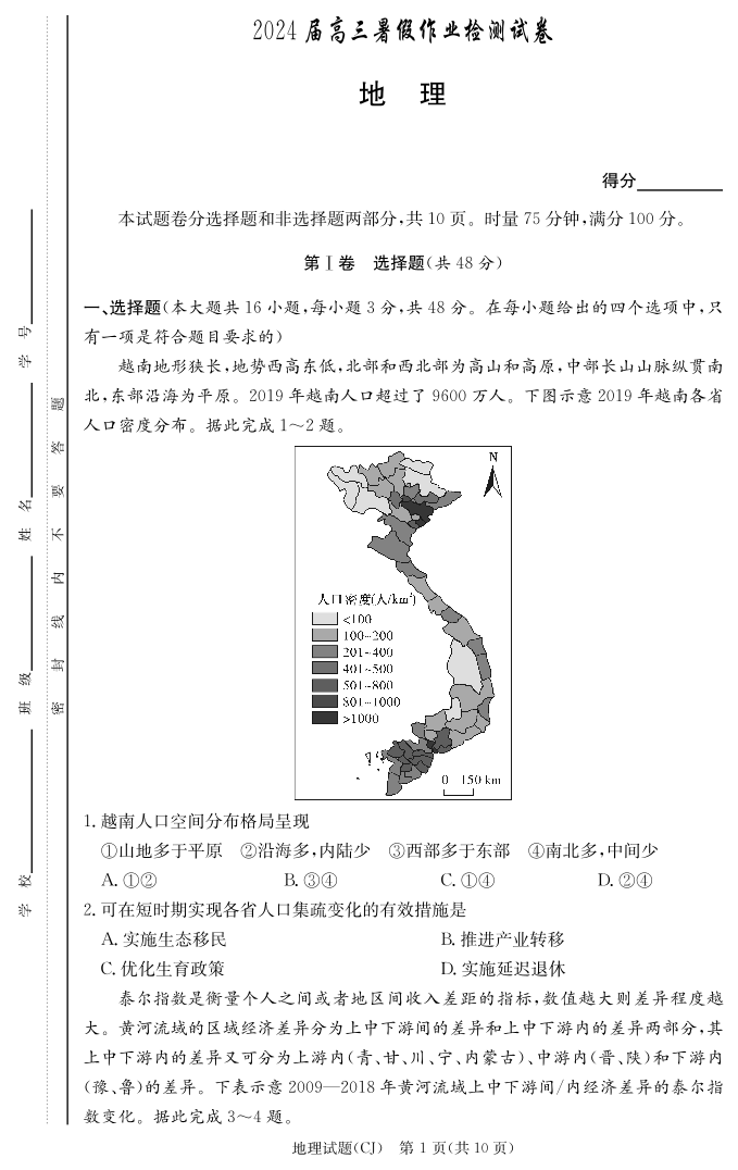 湖南省长沙市长郡中学2024届高三上学期入学考试地理