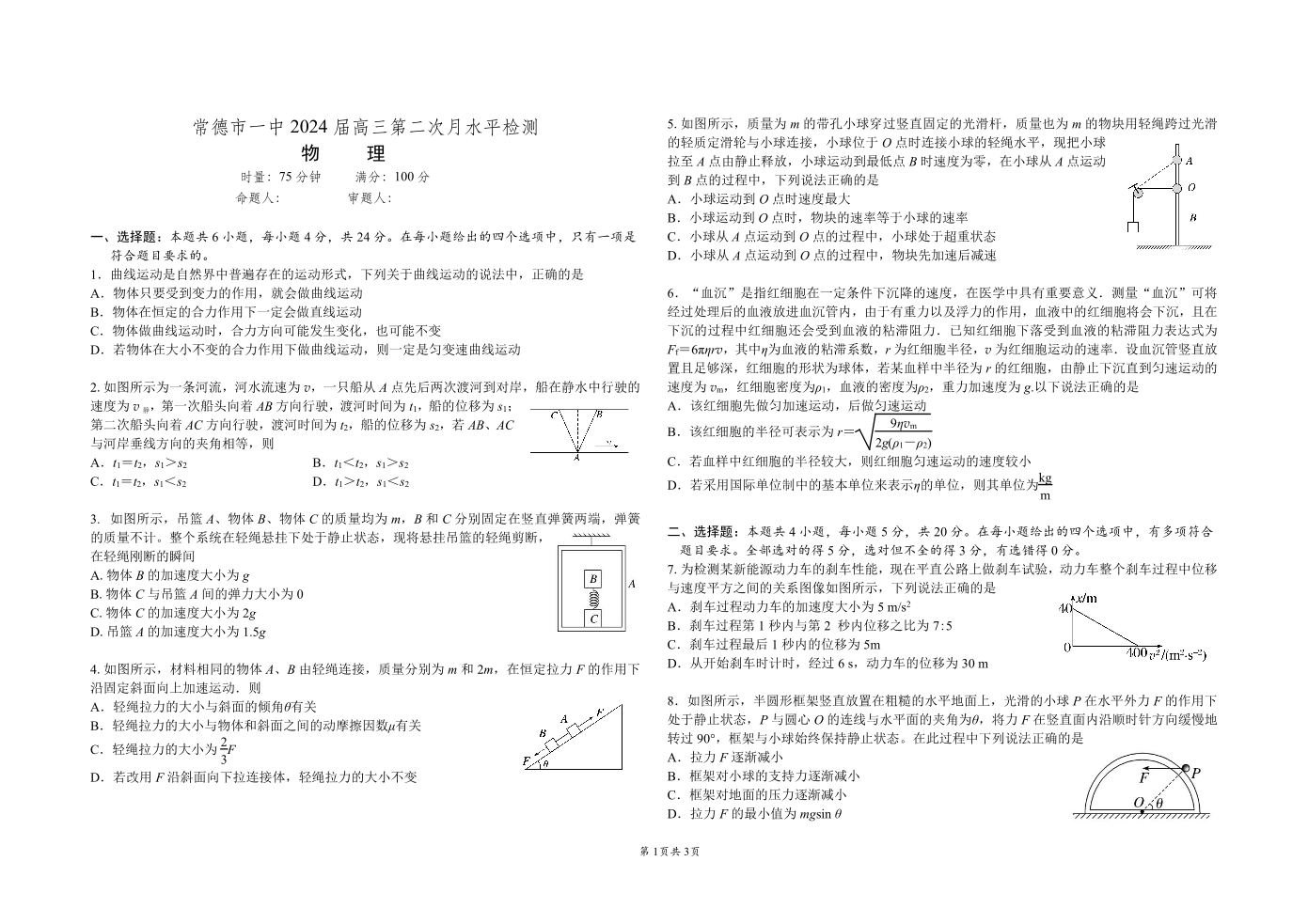 湖南省常德市第一中学2024届高三上学期第二次月考物理