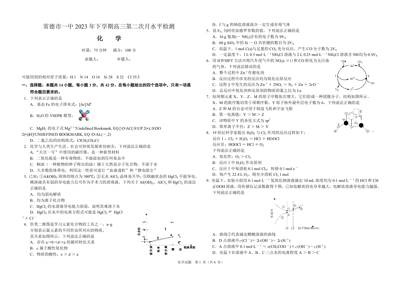 湖南省常德市第一中学2024届高三上学期第二次月考化学