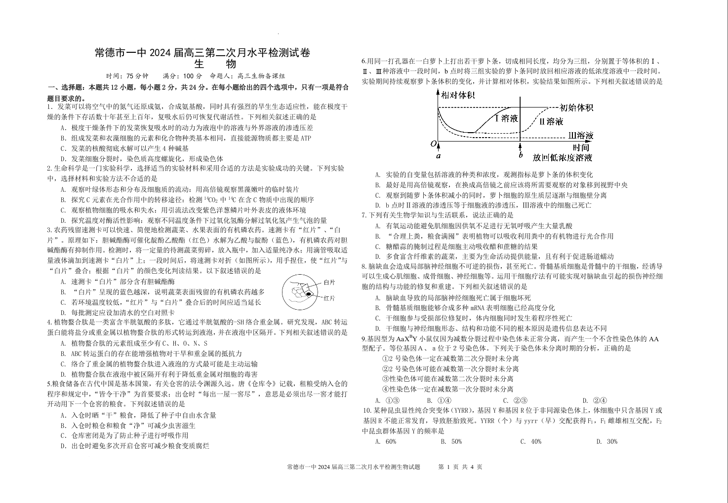 湖南省常德市第一中学2024届高三上学期第二次月考生物