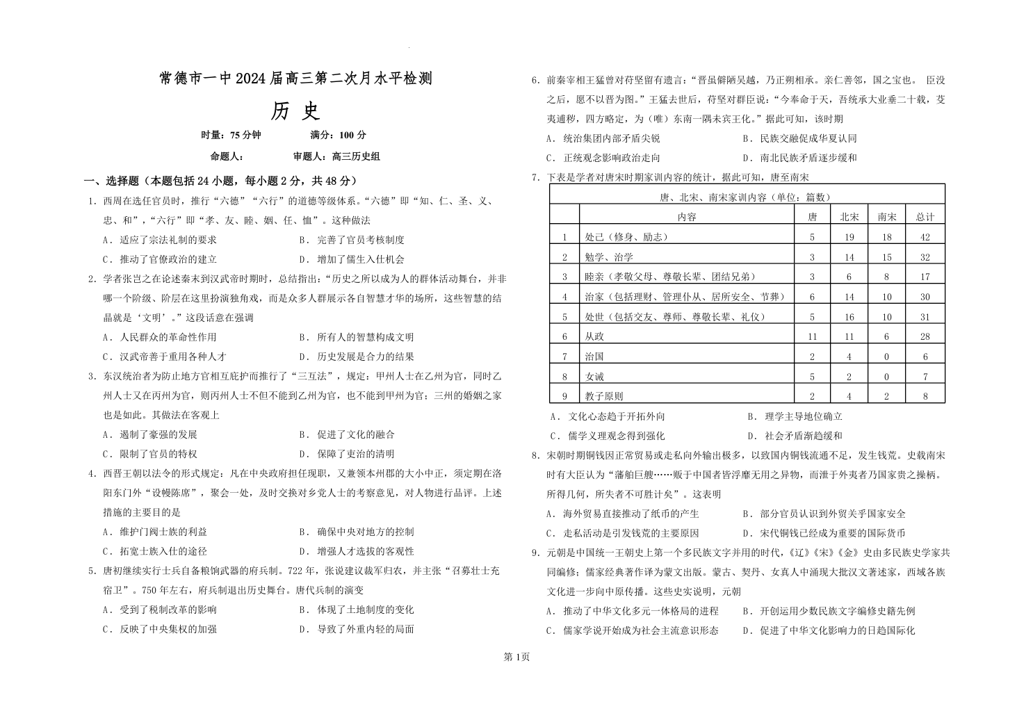 湖南省常德市第一中学2024届高三上学期第二次月考历史