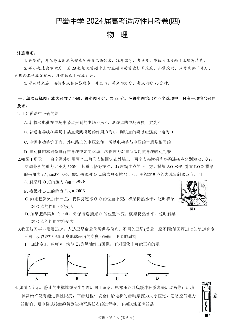 重庆市巴蜀中学2024届高考适应性月考卷(四)物理