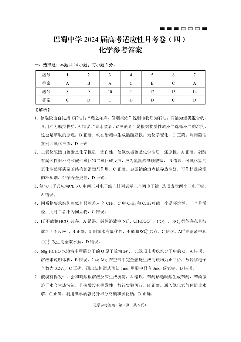 重庆市巴蜀中学2024届高考适应性月考卷(四)化学答案