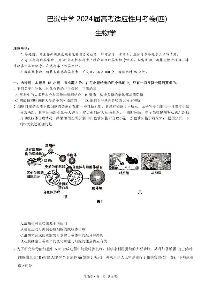 重庆市巴蜀中学2024届高考适应性月考卷(四)生物