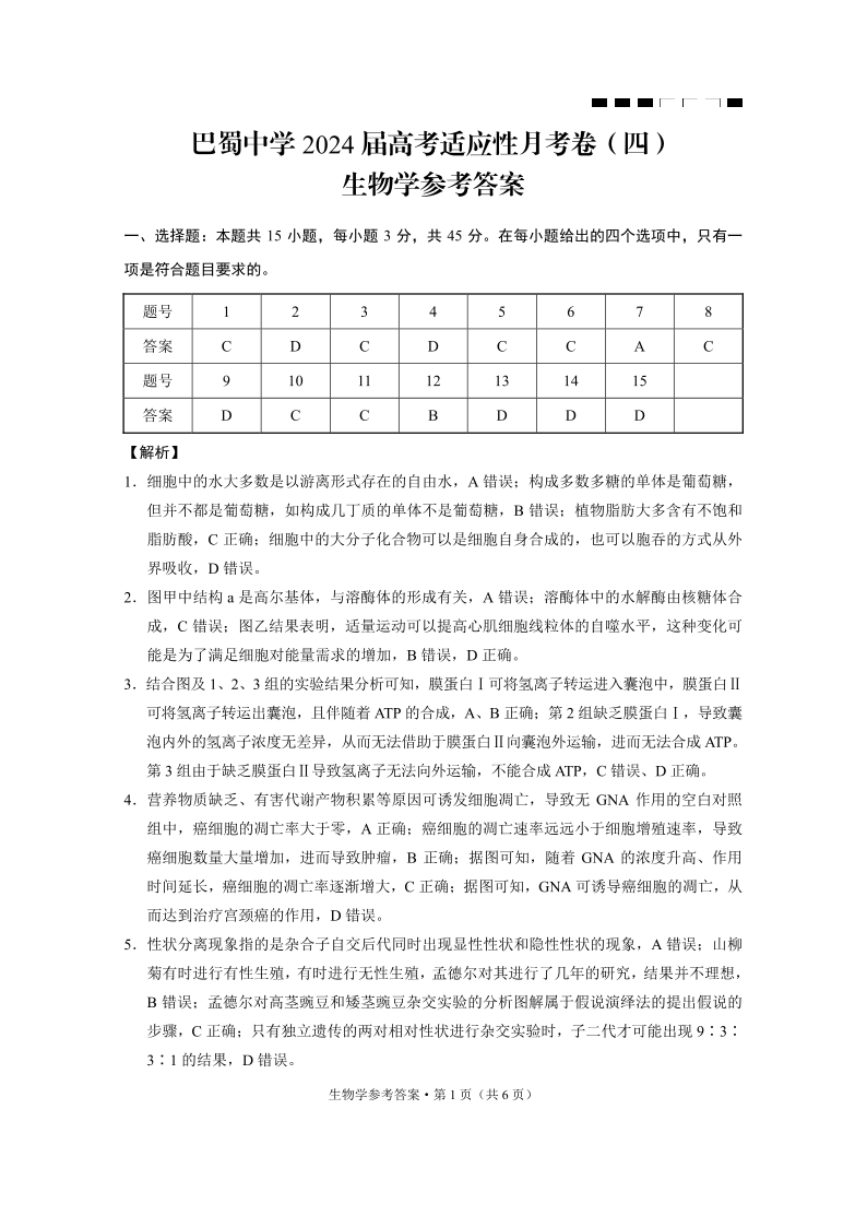 重庆市巴蜀中学2024届高考适应性月考卷(四)生物答案