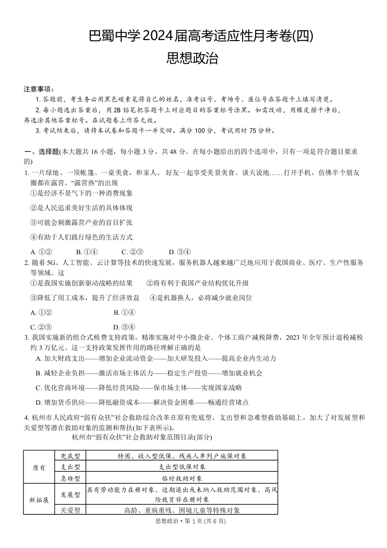 重庆市巴蜀中学2024届高考适应性月考卷(四)政治