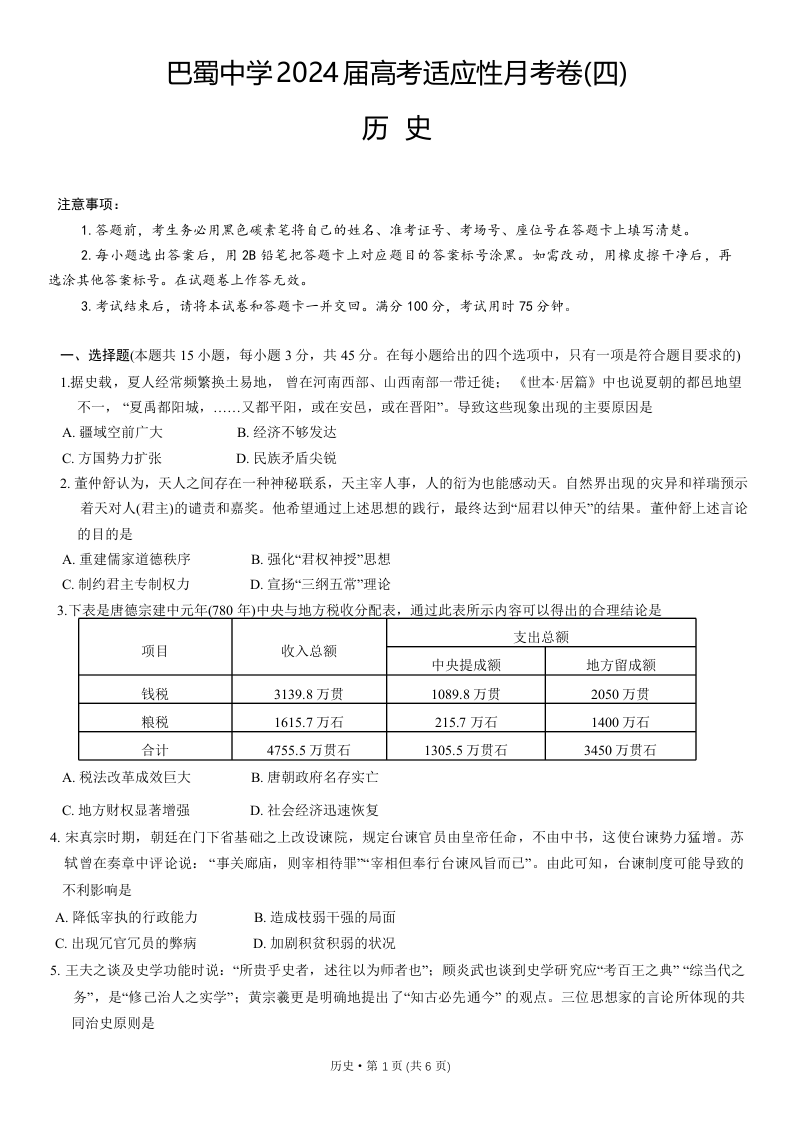 重庆市巴蜀中学2024届高考适应性月考卷(四)历史