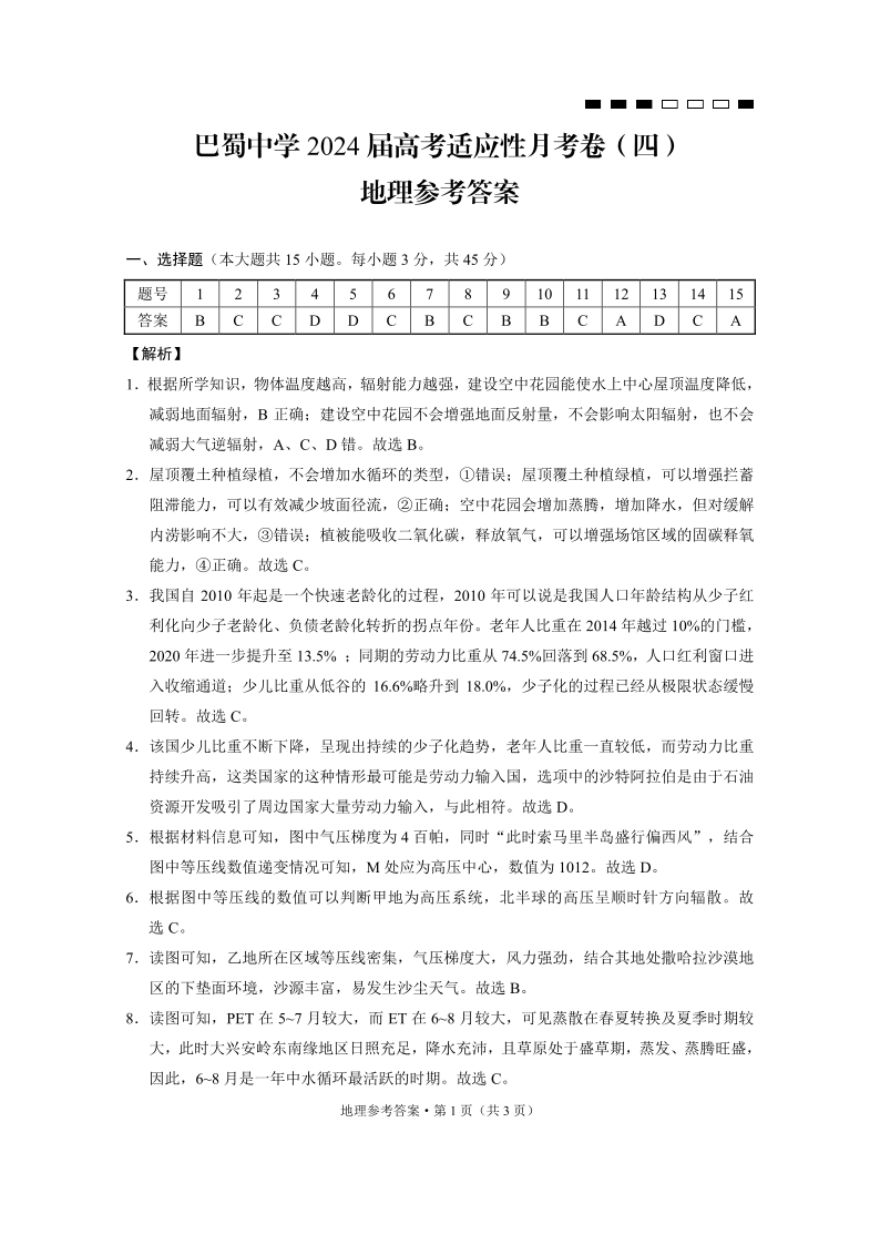 重庆市巴蜀中学2024届高考适应性月考卷(四)地理答案