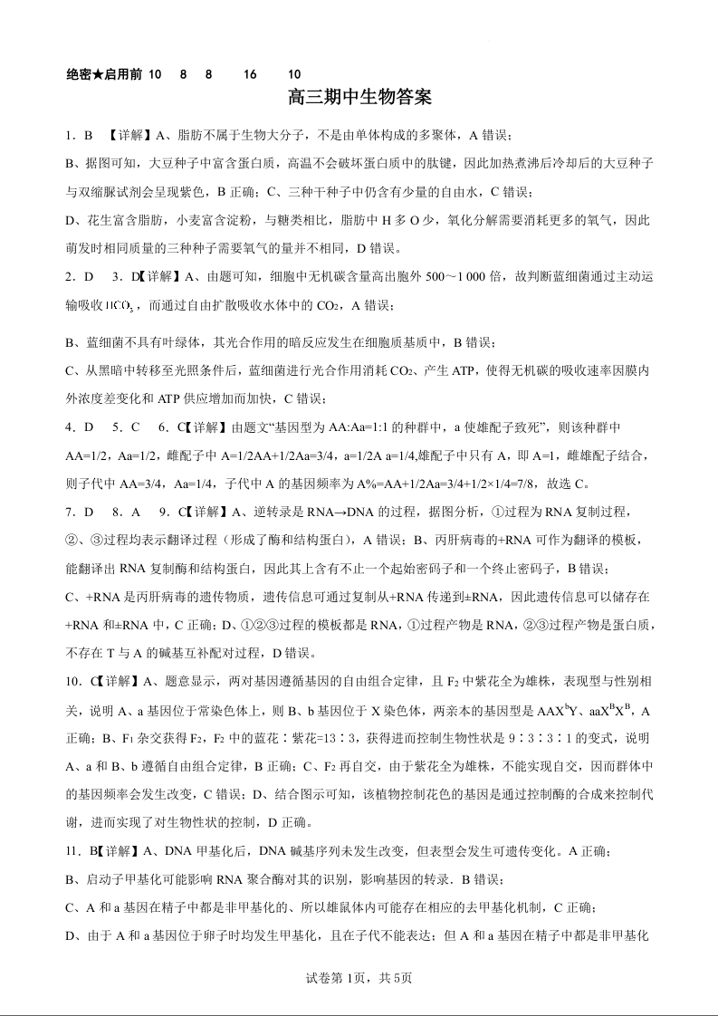 天津市实验中学滨海学校2024届高三上学期期中质量调查考试生物答案