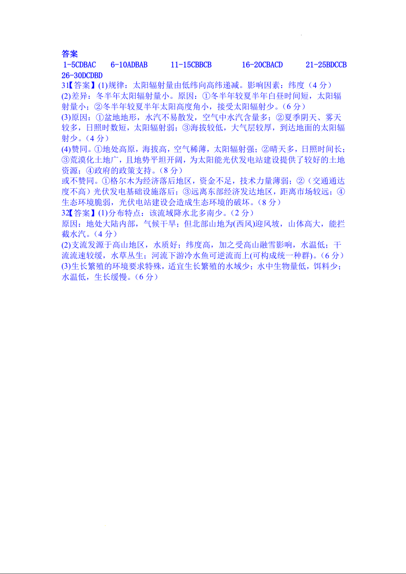 天津市实验中学滨海学校2024届高三上学期期中质量调查考试地理答案