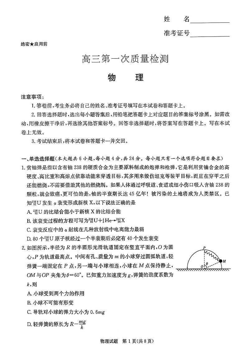 湖南省炎德英才大联考2024届高三上学期第一次质量检测物理