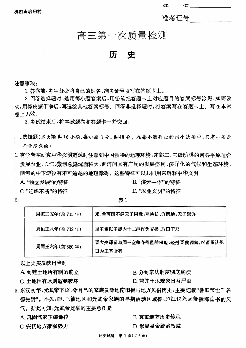 湖南省炎德英才大联考2024届高三上学期第一次质量检测历史