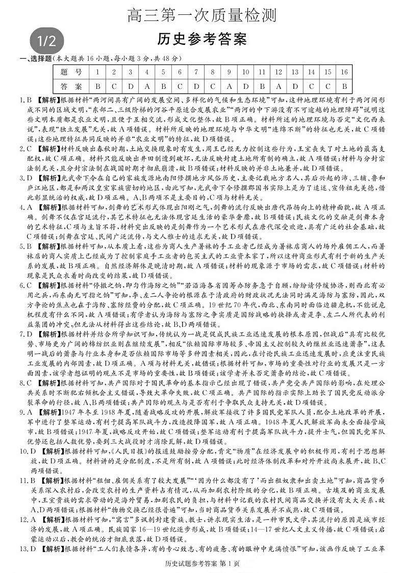 湖南省炎德英才大联考2024届高三上学期第一次质量检测历史答案