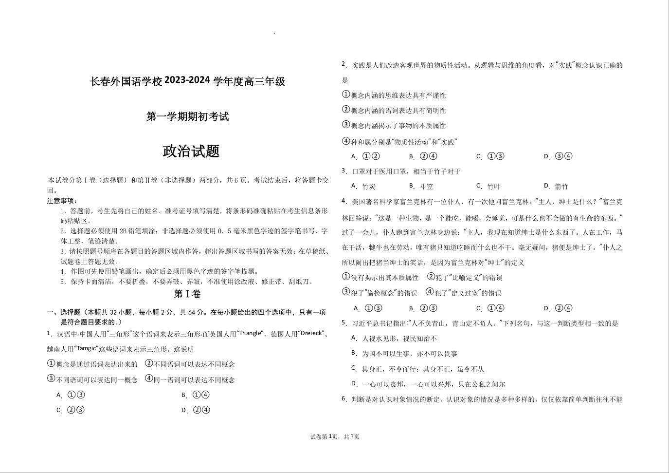 吉林省长春外国语学校2024届高三上学期开学考试政治+答案