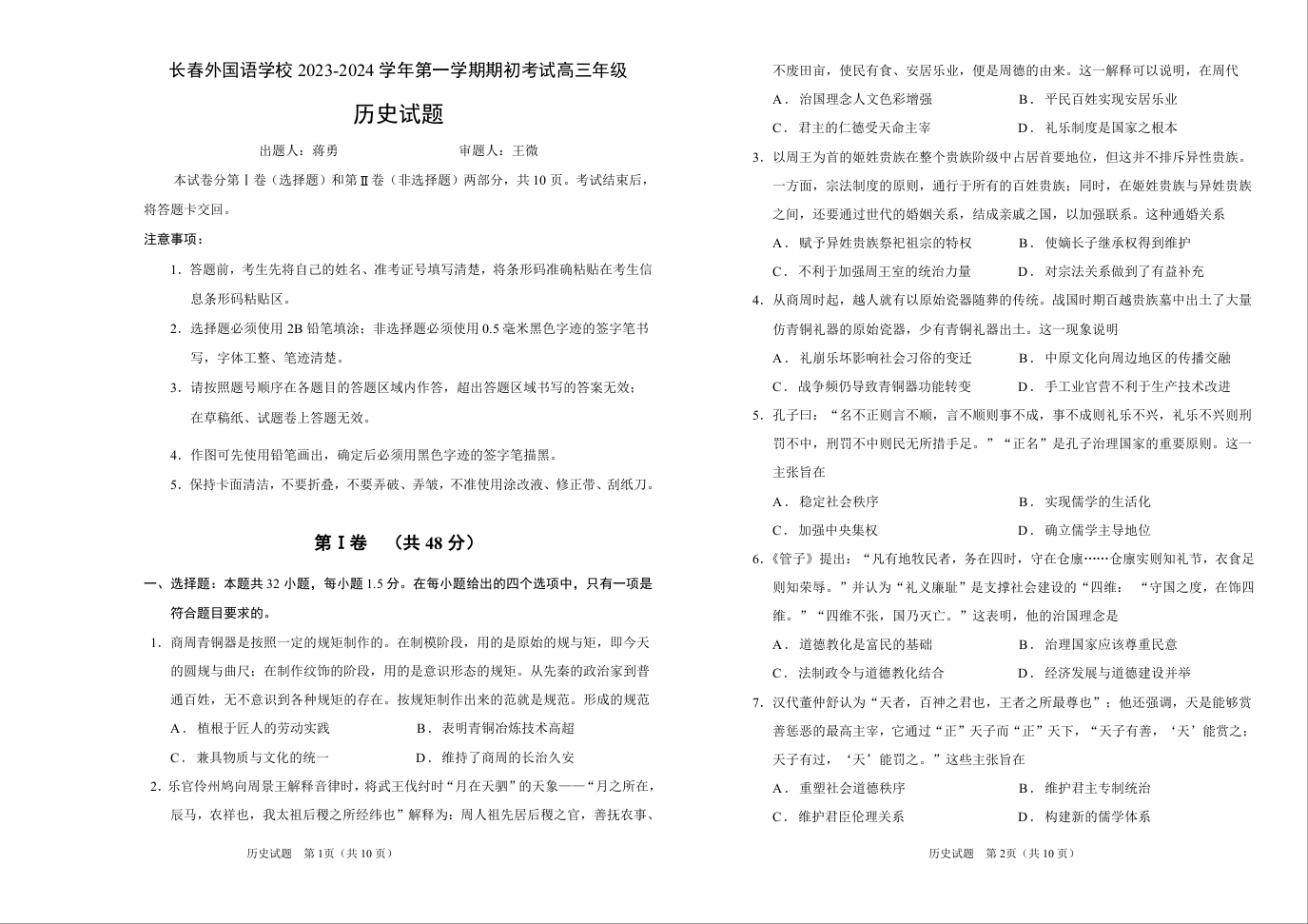 吉林省长春外国语学校2024届高三上学期开学考试历史+答案