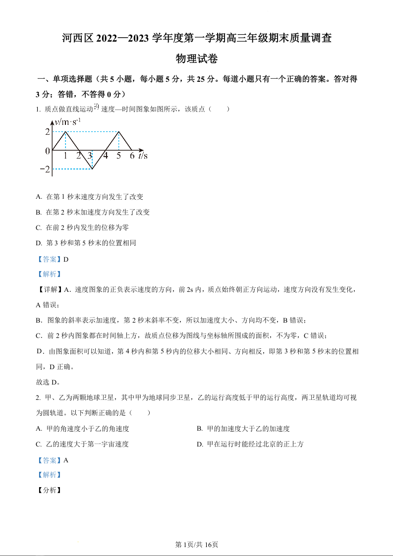 天津市河西区2023-2024学年高三上学期期中质量调查试题物理(精品解析版)