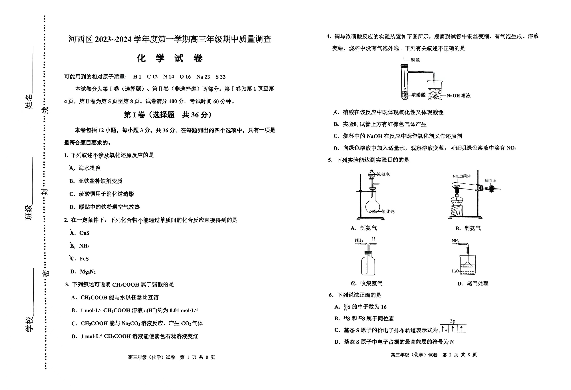 天津市河西区2023-2024学年高三上学期期中质量调查试题化学