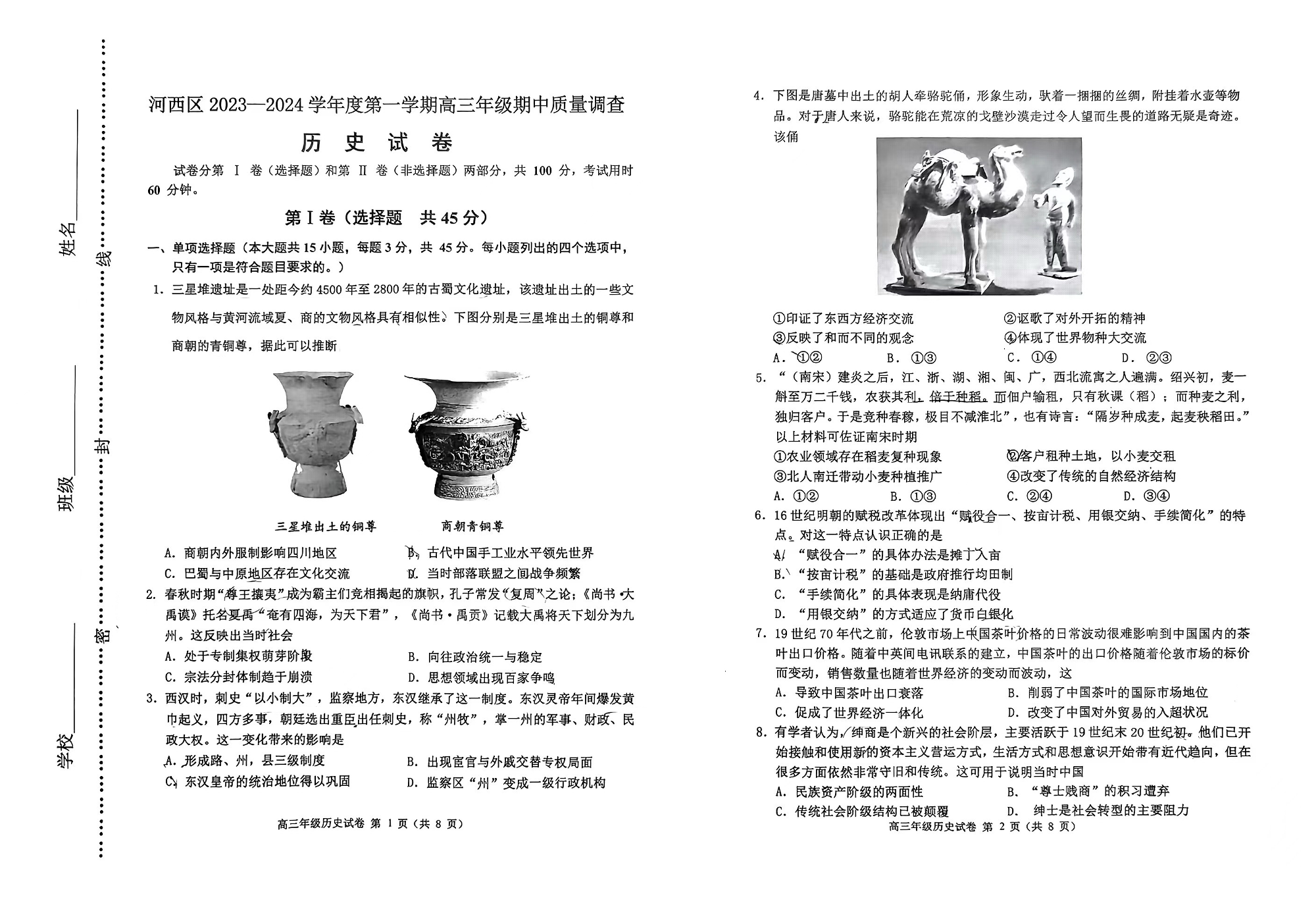天津市河西区2023-2024学年高三上学期期中质量调查试题历史