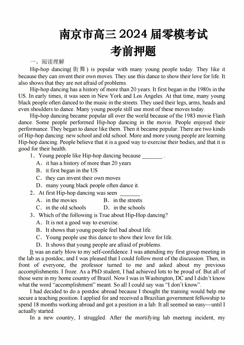 江苏省南京市2024届高三上学期零模考试英语+答案