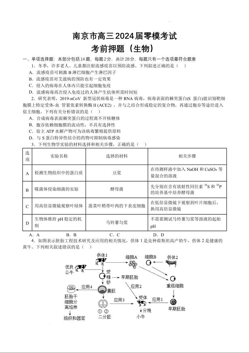 江苏省南京市2024届高三上学期零模考试生物