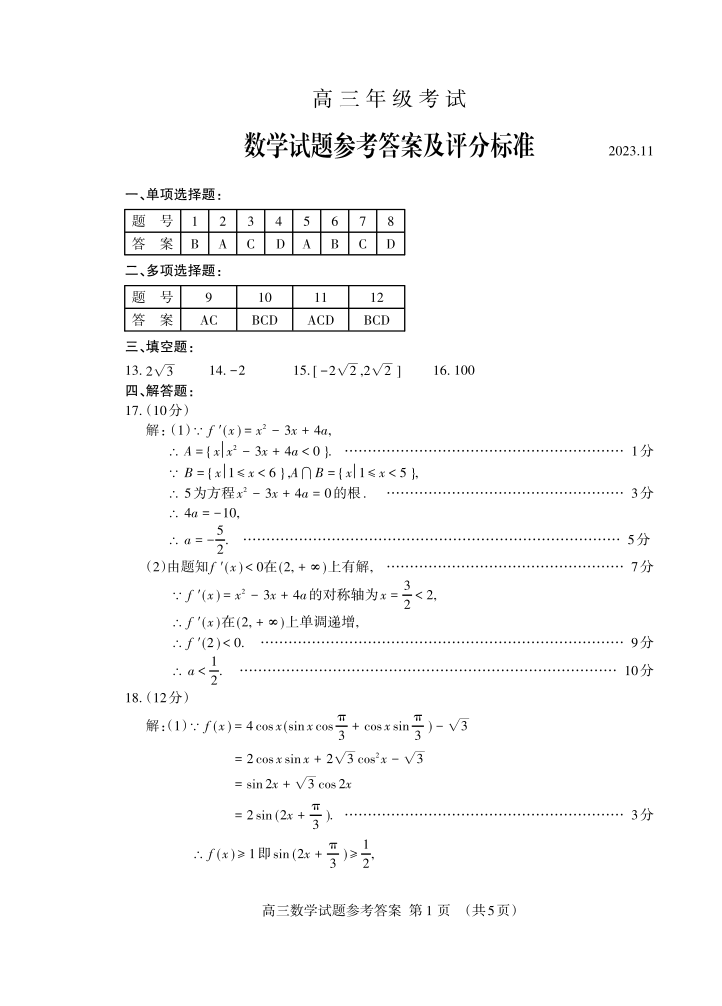 山东省泰安市2024届高三上学期期中考试数学答案