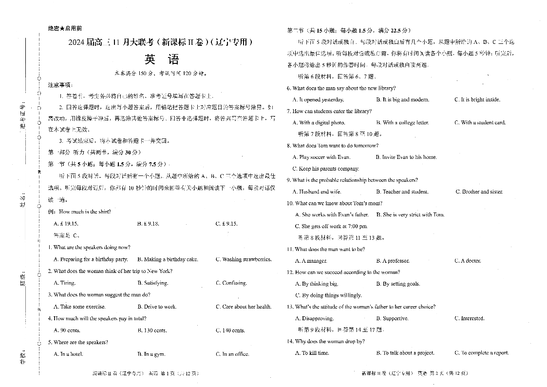 辽宁省2024届高三11月半期大联考(辽宁专用)英语