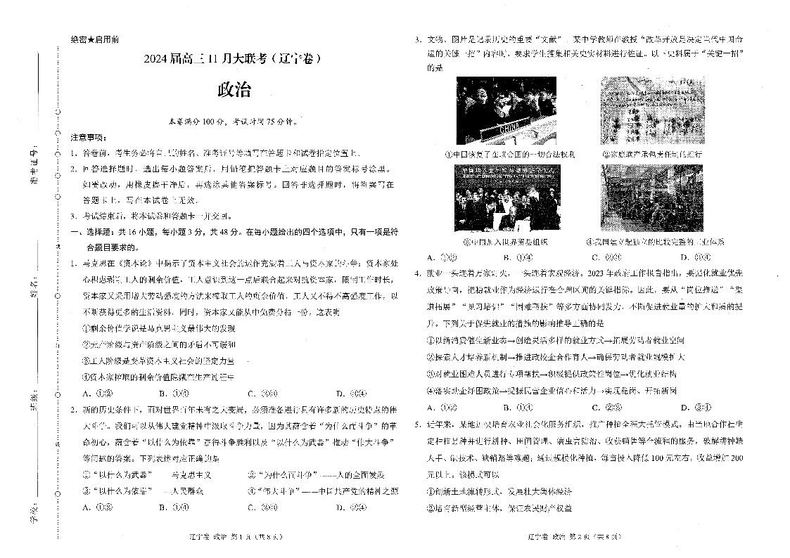 辽宁省2024届高三11月半期大联考(辽宁专用)政治