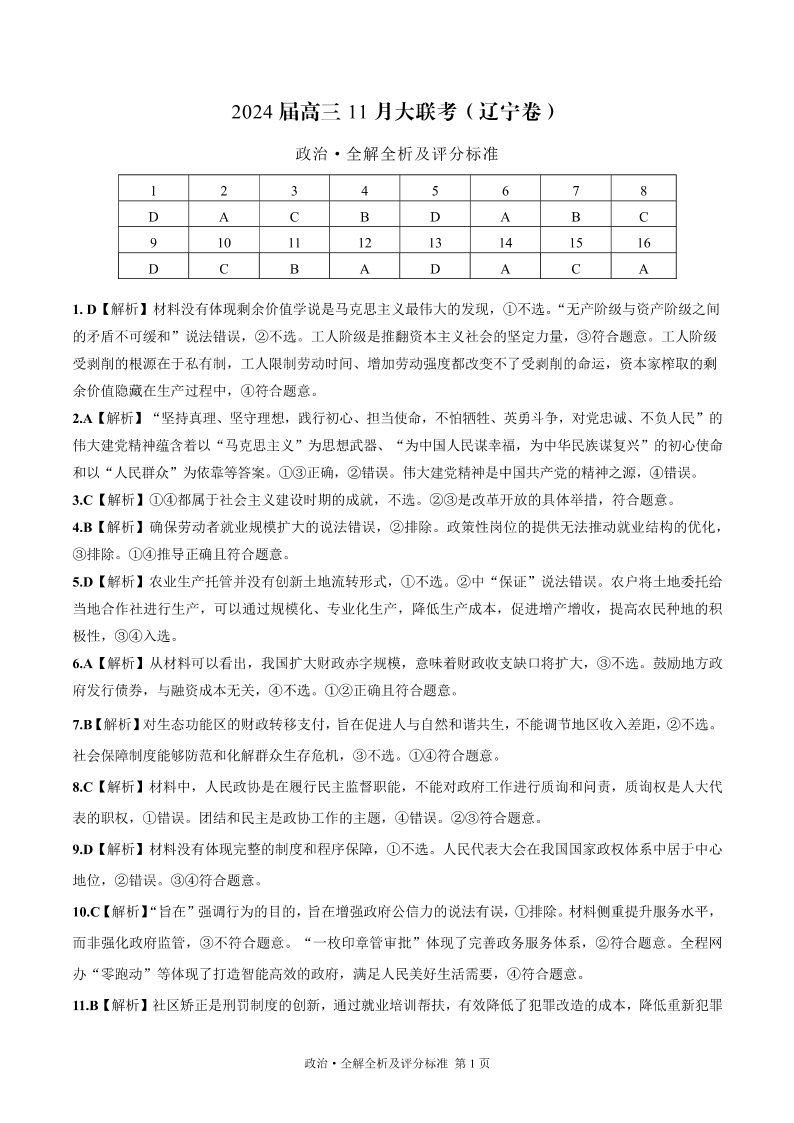辽宁省2024届高三11月半期大联考(辽宁专用)政治答案