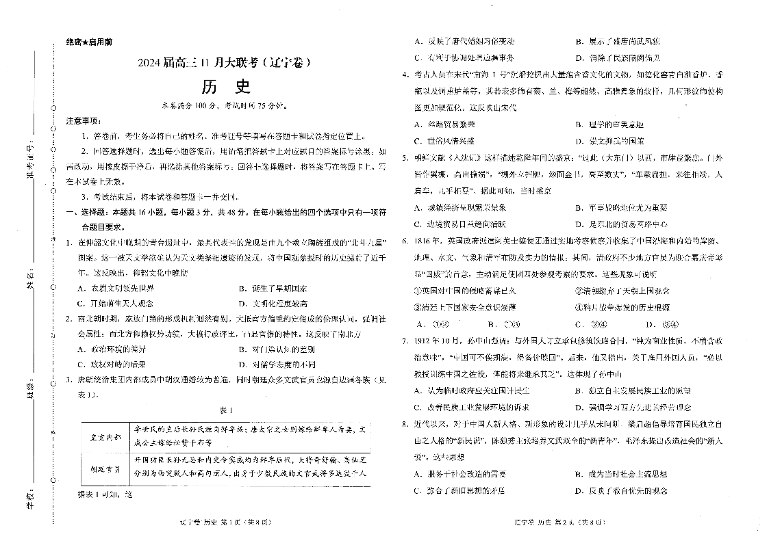 辽宁省2024届高三11月半期大联考(辽宁专用)历史