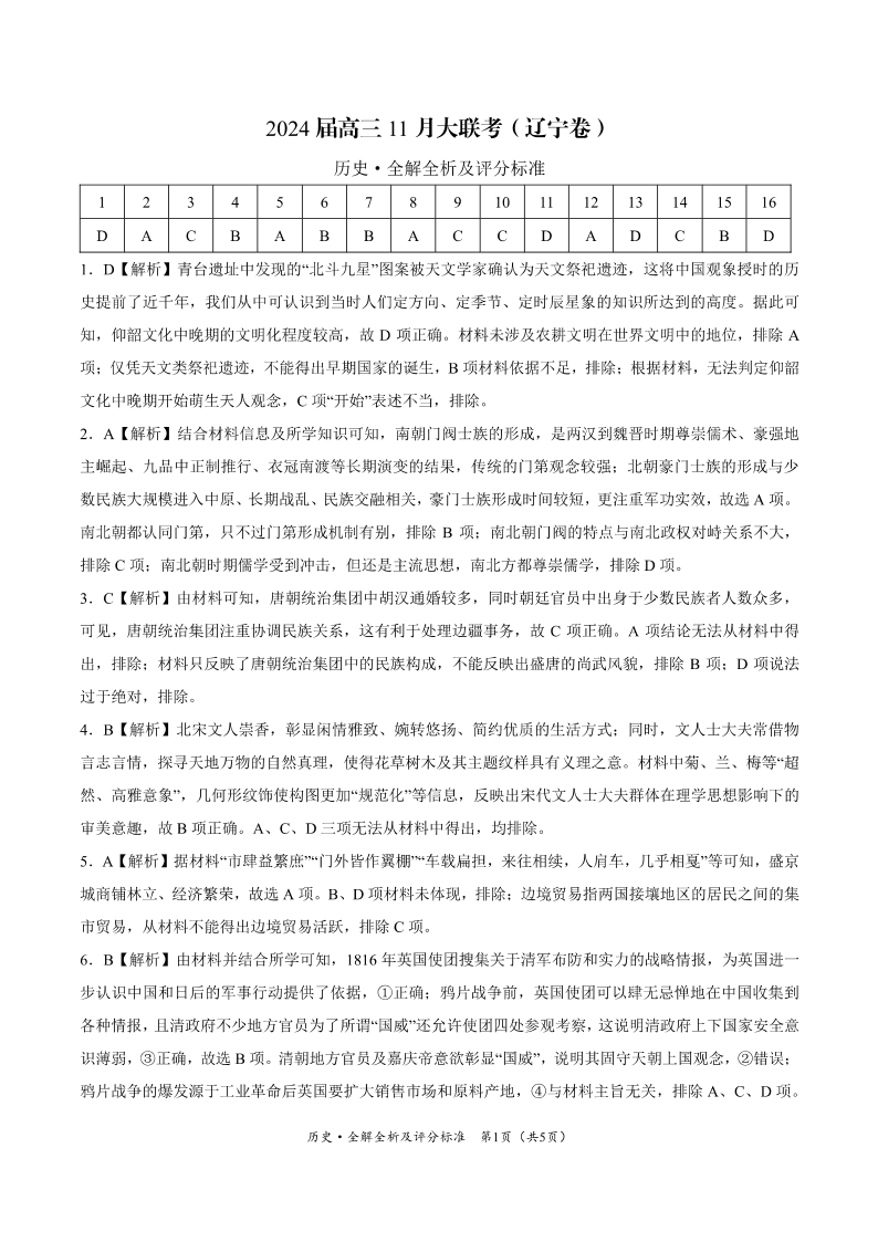 辽宁省2024届高三11月半期大联考(辽宁专用)历史答案