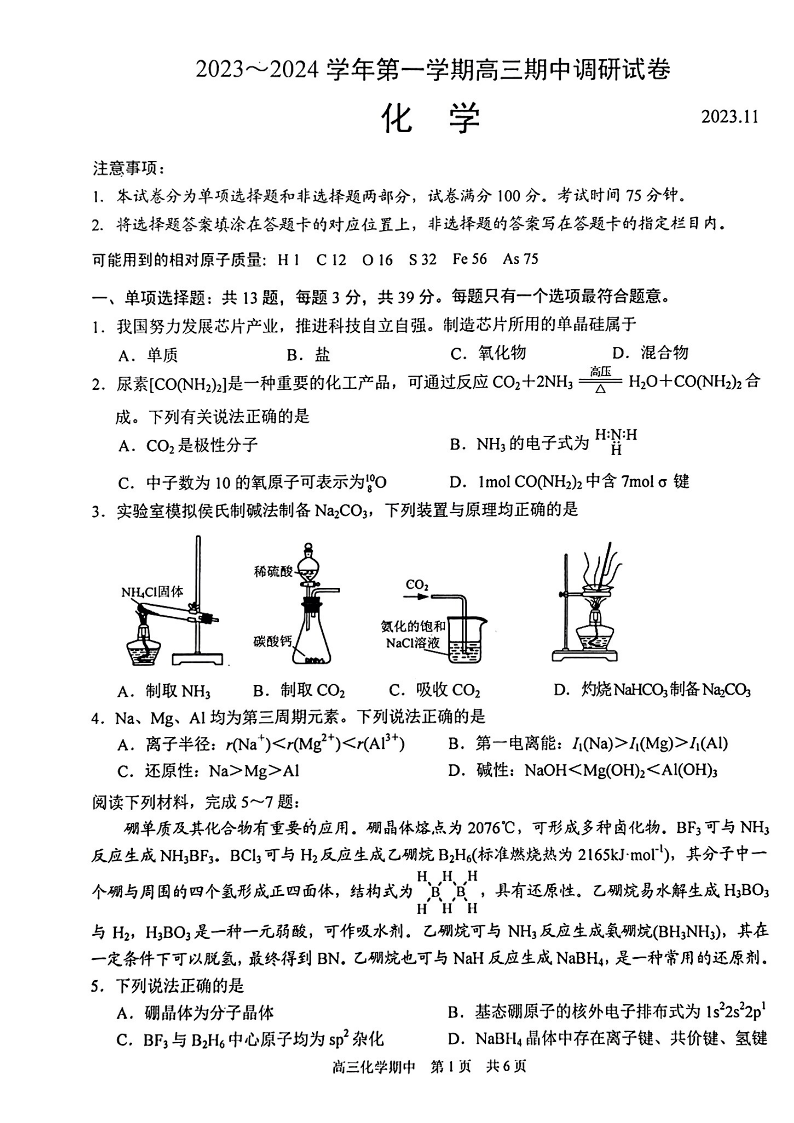 江苏省苏州市2024届高三上学期期中调研考试化学答案