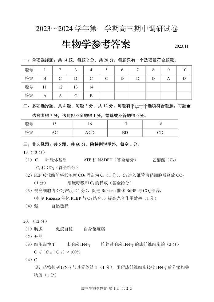 江苏省苏州市2024届高三上学期期中调研考试生物答案