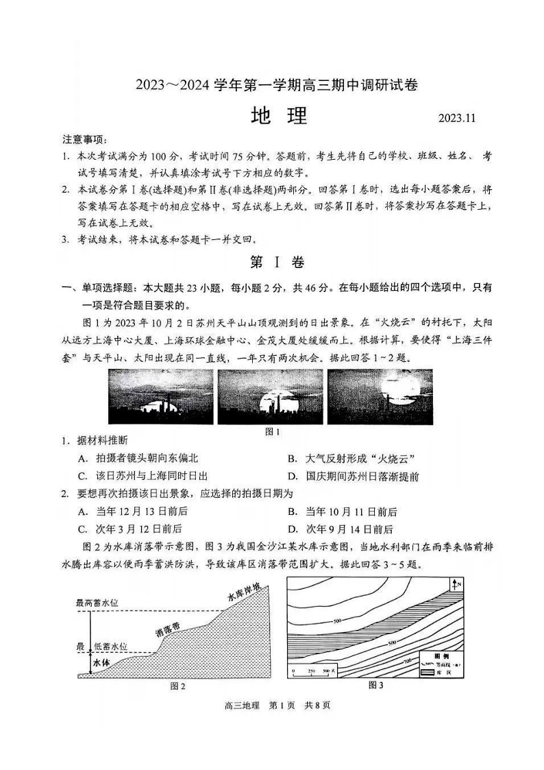 江苏省苏州市2024届高三上学期期中调研考试地理+答案