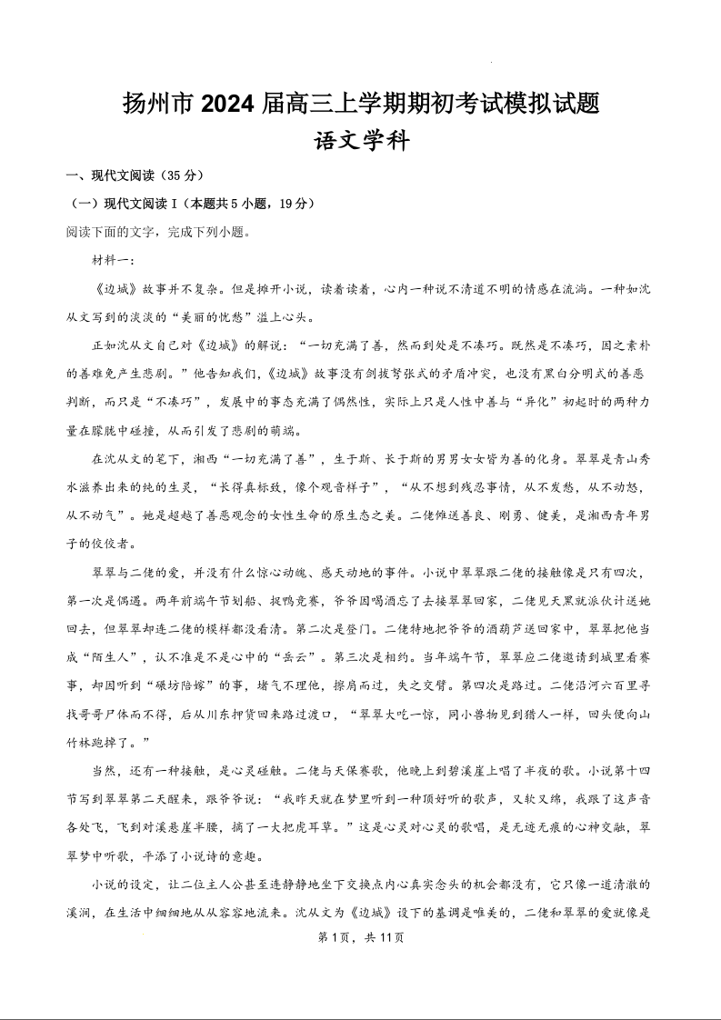 江苏省扬州市2024届高三上学期期初考试模拟语文