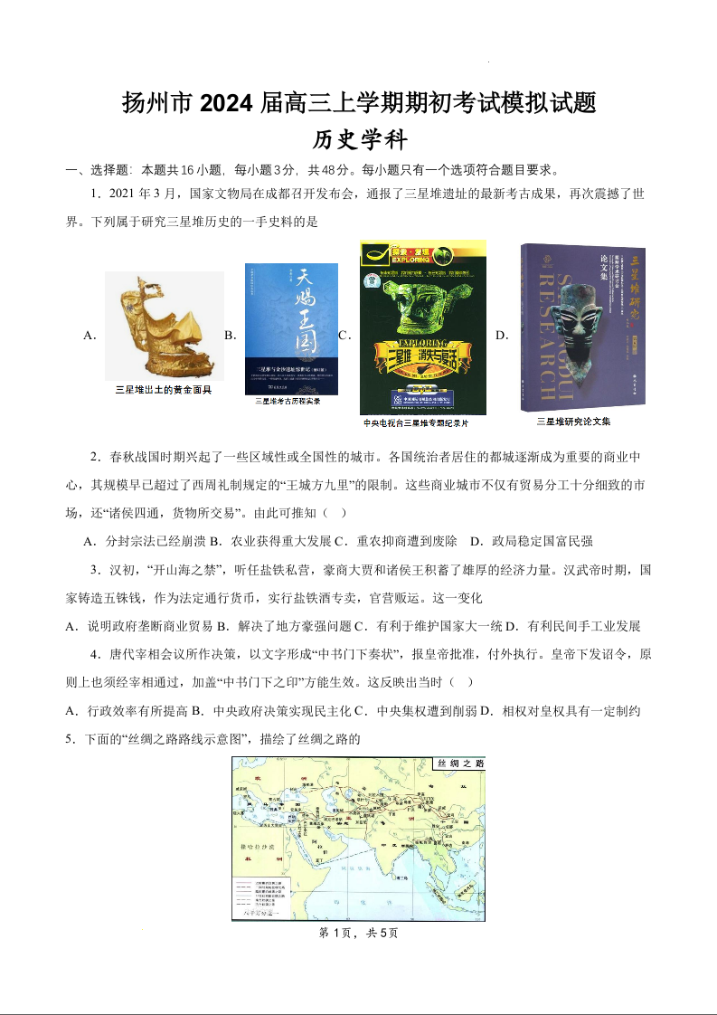 江苏省扬州市2024届高三上学期期初考试模拟历史