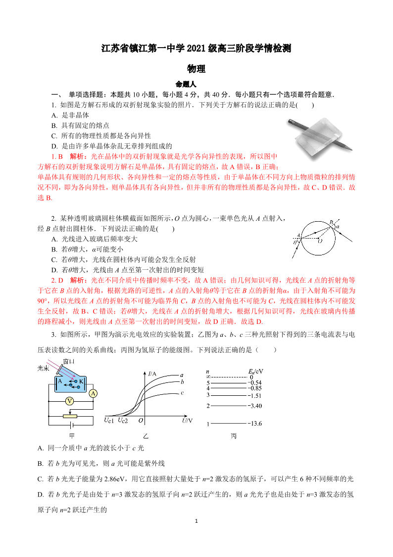 江苏省镇江第一中学2024届高三上学期期初阶段考物理答案