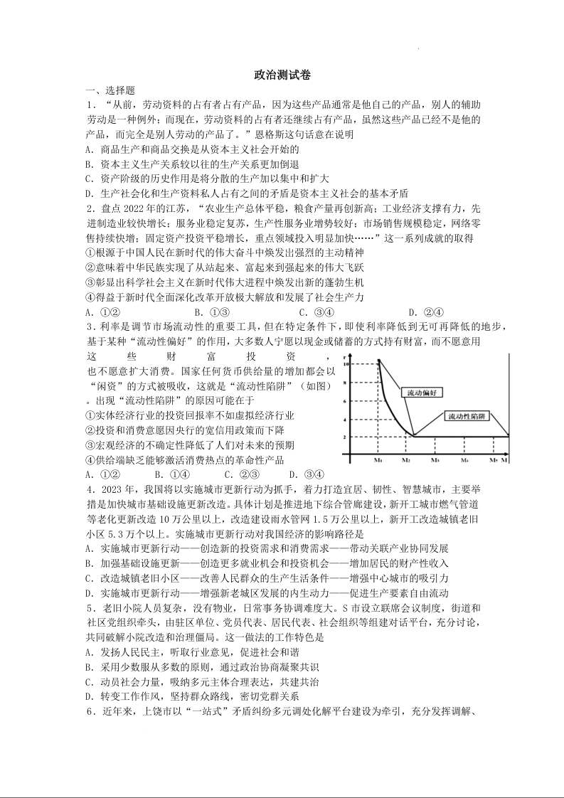 江苏省镇江第一中学2024届高三上学期期初阶段考政治