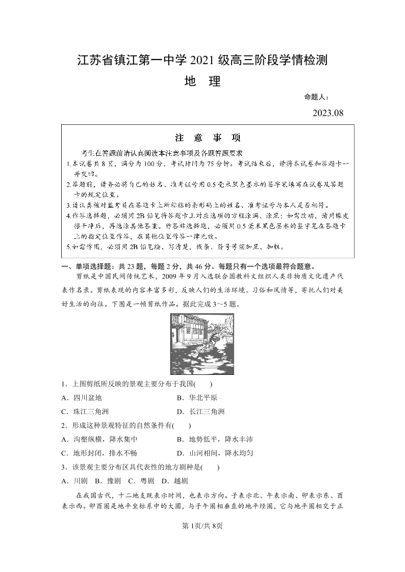 江苏省镇江第一中学2024届高三上学期期初阶段考地理