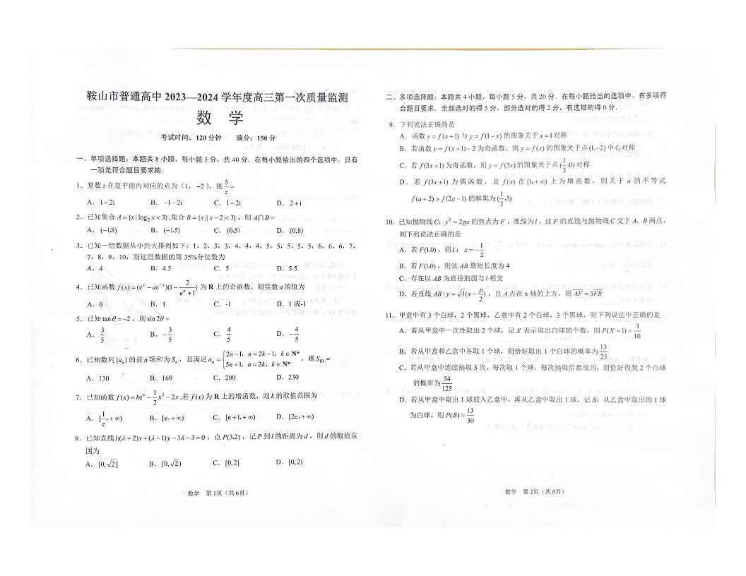 辽宁省鞍山市2024届高三上学期第一次质量监测数学