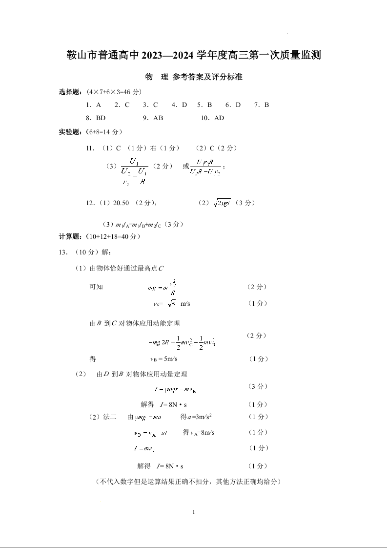 辽宁省鞍山市2024届高三上学期第一次质量监测物理答案