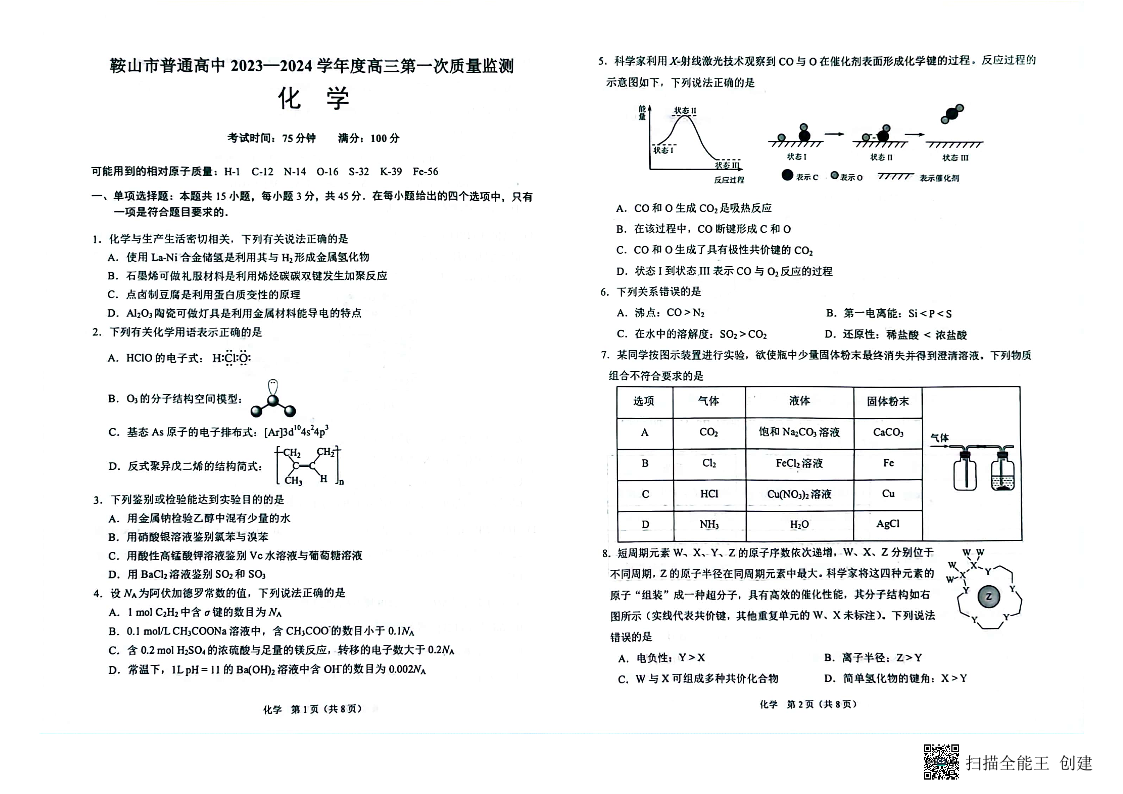 辽宁省鞍山市2024届高三上学期第一次质量监测化学