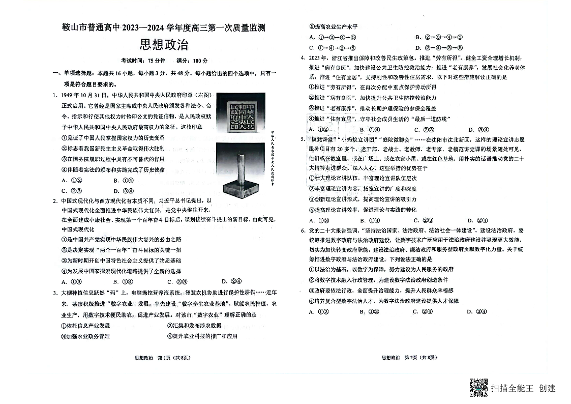 辽宁省鞍山市2024届高三上学期第一次质量监测政治
