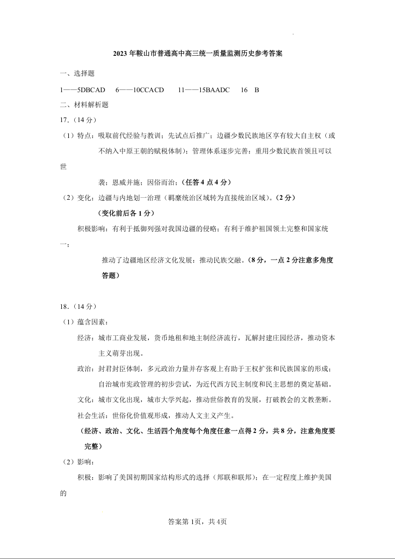 辽宁省鞍山市2024届高三上学期第一次质量监测历史答案