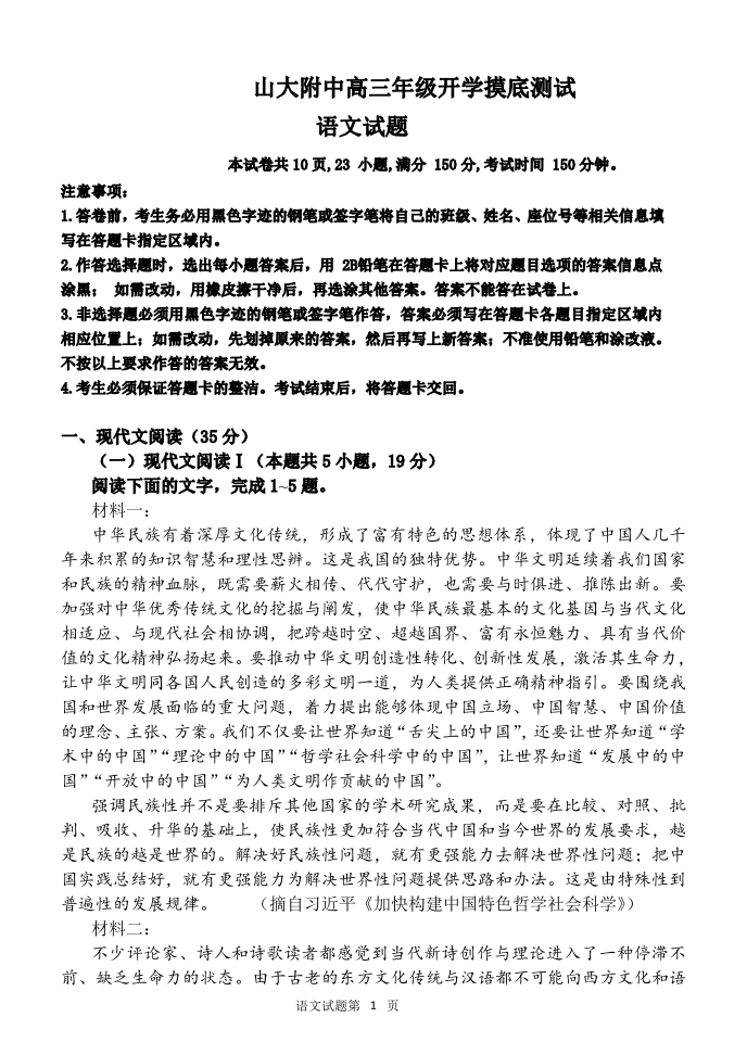 山东省菏泽市定陶区明德学校(山大附中实验学校)2024届高三上学期开学考语文+答案