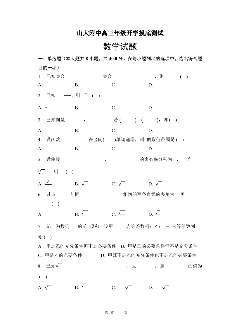 山东省菏泽市定陶区明德学校(山大附中实验学校)2024届高三上学期开学考数学+答案