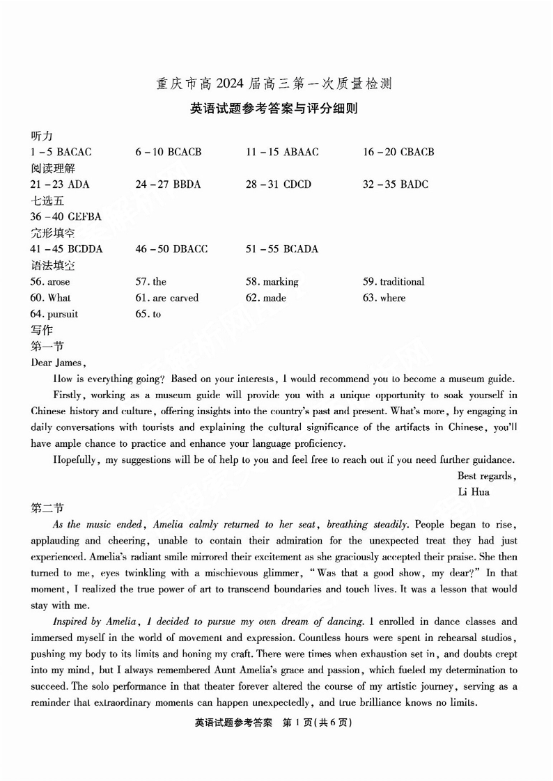 重庆市南开中学高2024届高三第一次质量检测英语答案